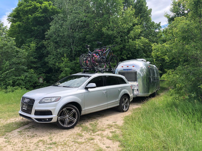 There are folks parked under every available shade tree along the park road, so we pull onto a large grassy knoll under a pleasant grove of trees near a softball field, setting up shop there after finding a sturdy tree for the TRX. We stick around for the afternoon with Mari taking her Webex calls in the car while Datta conducts business from the trailer. This is a formula that works well moving forward.