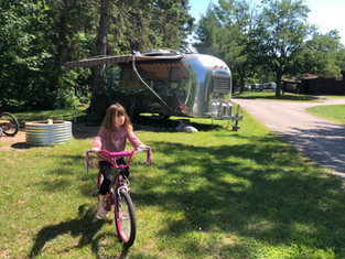 It’s 80 degrees out, with perfect humidity and no bugs. We decide to enjoy the rest of the day at our campsite instead of rushing off to the the falls, and Sibri meets a great group of new friends including twin girls Aurora and Aspen, their brother Aiken and their friend Madison. The kids hit it off famously, building a kitty sand fort on the beach. Bella is a little overwhelmed with all the attention and runs away twice, only to be tracked down and treated to another raft float on the lake before the kids take off for a bike ride across the park.